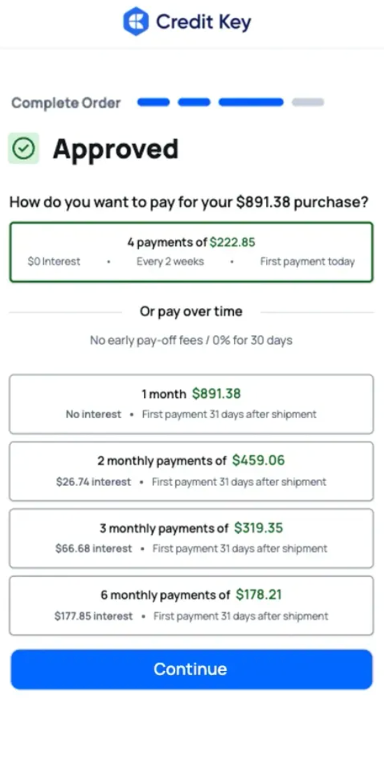 Choose your payment terms and get approved instantly. Flexible options to fit your budget.