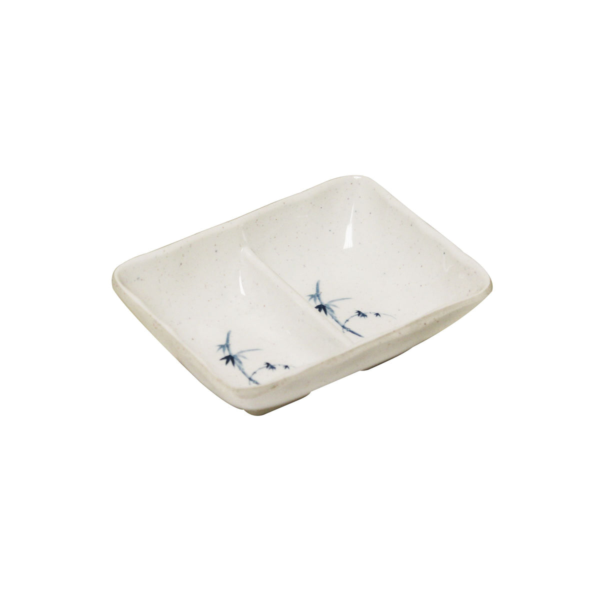 1-1/2 oz, 3-5/8" x 2-3/4" x 1-1/8", Divided Sauce Dish, Blue Bamboo Dinnerware, Melamine, BPA Free, Dishwasher Safe, Break-Resistant, Shatter-Resistant, No Microwave, No Oven, NSF
