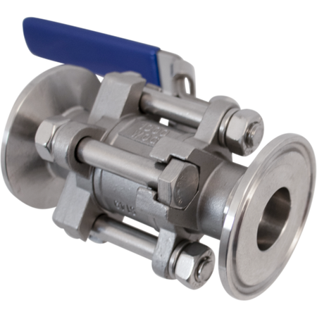 Stainless steel 3-piece ball valve with tri-clamp connections. A great option for T.C. kettles, pumps, and conicals to go from 1.5" tri-clamp to any 1.5" tri-clamp connection or accessory. Full port for higher flow rate.
