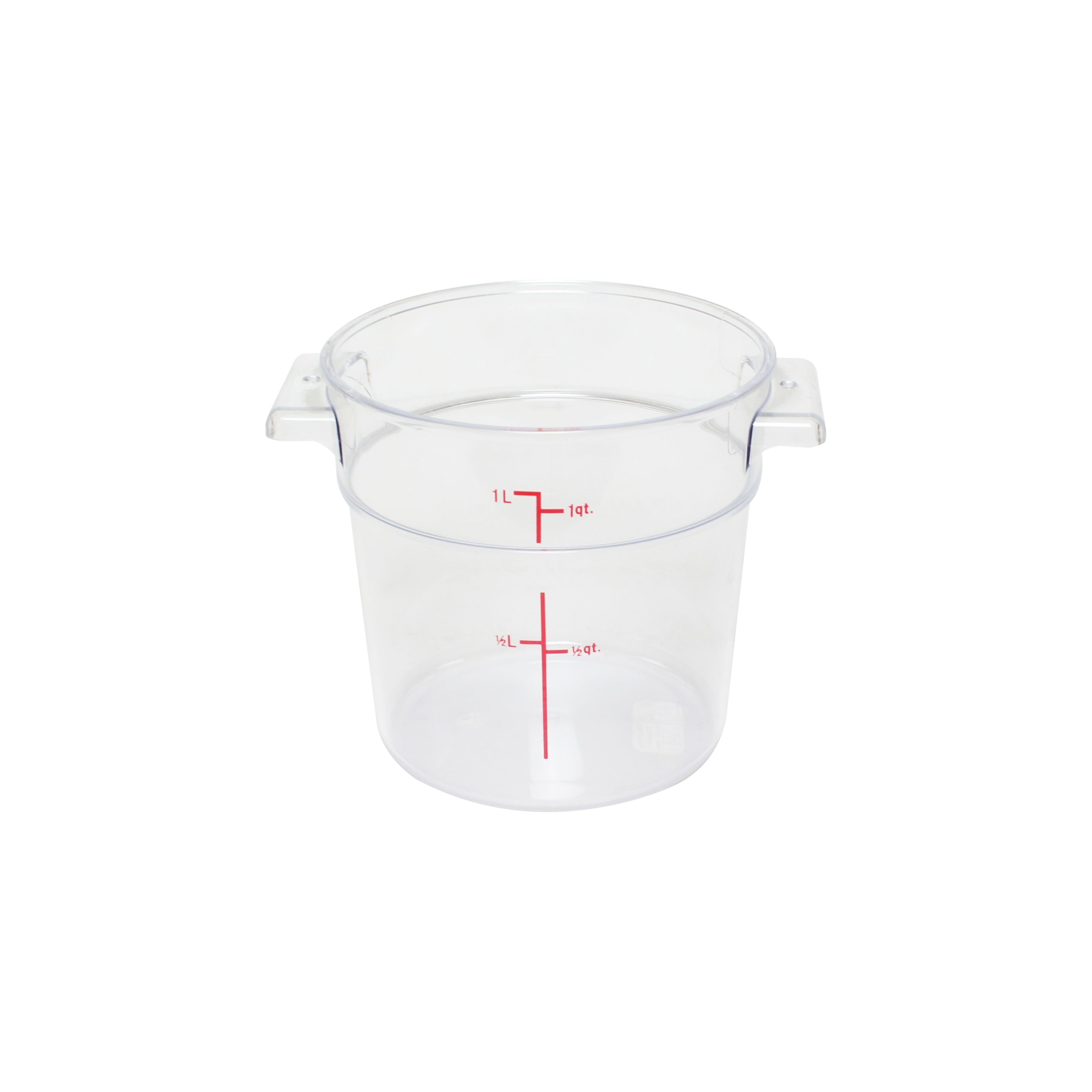 1 qt, 5" Diameter x 5" Height, Round Food Storage Container, Clear Color, Polycarbonate, withstand temperature from -40°F up to 210°F, Dishwasher Safe, Break-Resistant, Shatter-Resistant, No Microwave, No Oven, NSF