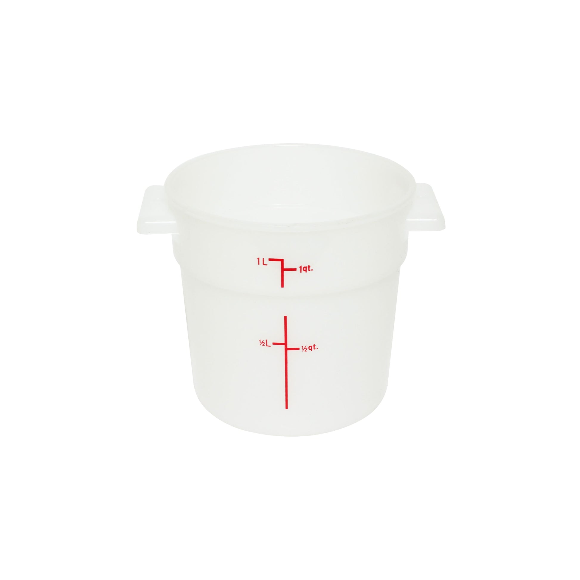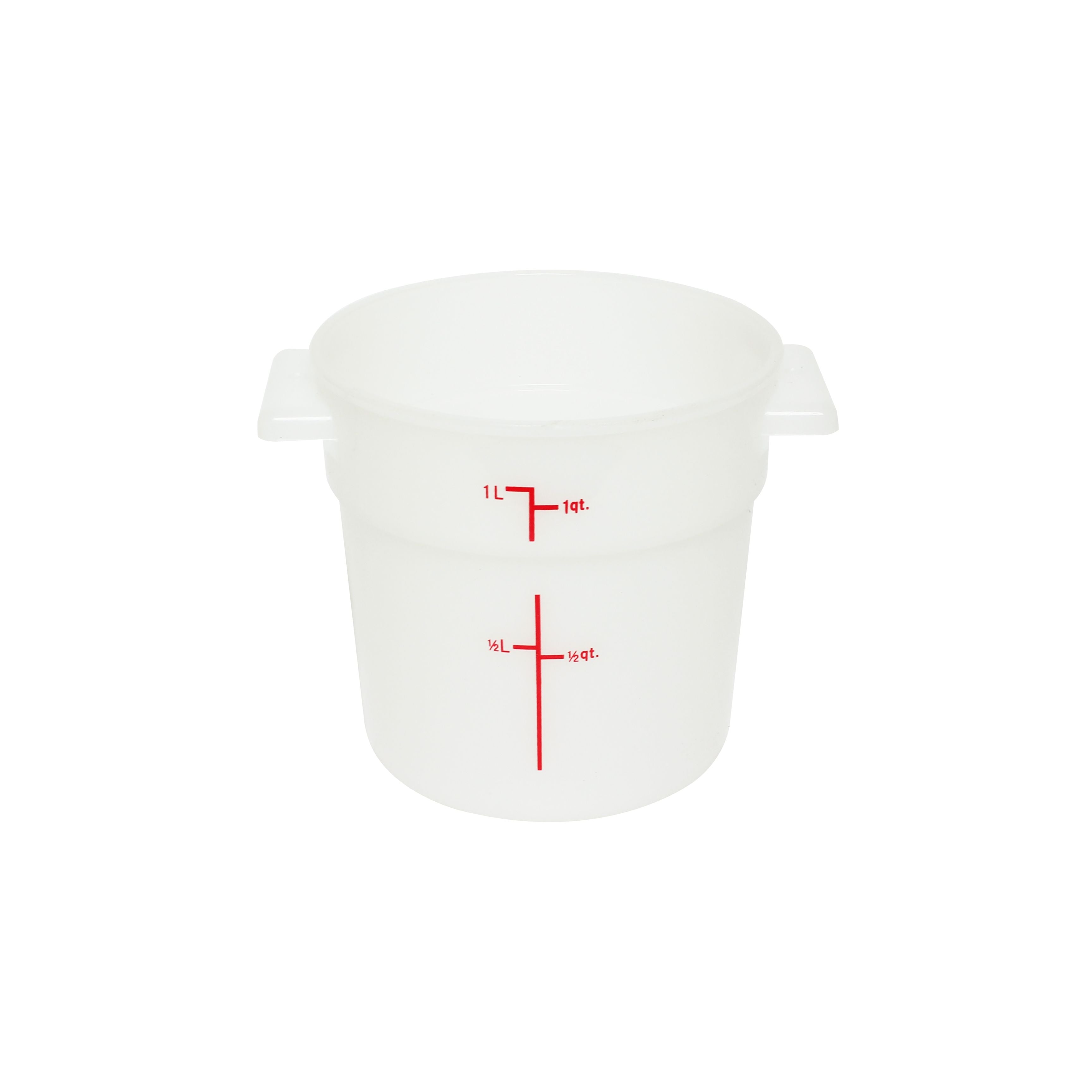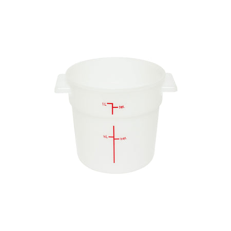 1 qt, 5" Diameter x 5" Height, Round Food Storage Container, White Color, Polypropylene, withstand temperature from -40°F up to 160°F, Dishwasher Safe, No Microwave, No Oven, NSF