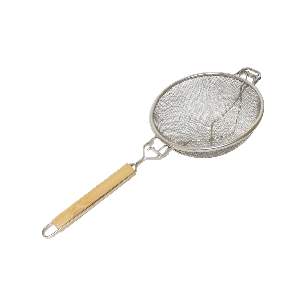 10-1/2" Diameter x 6-3/8" Height, 13" Handle Length, Reinforced Fine Double Mesh Strainer, Nickel Plated Wire, Frame & Support with Flat Wooden Handle, Extra Cross-Support