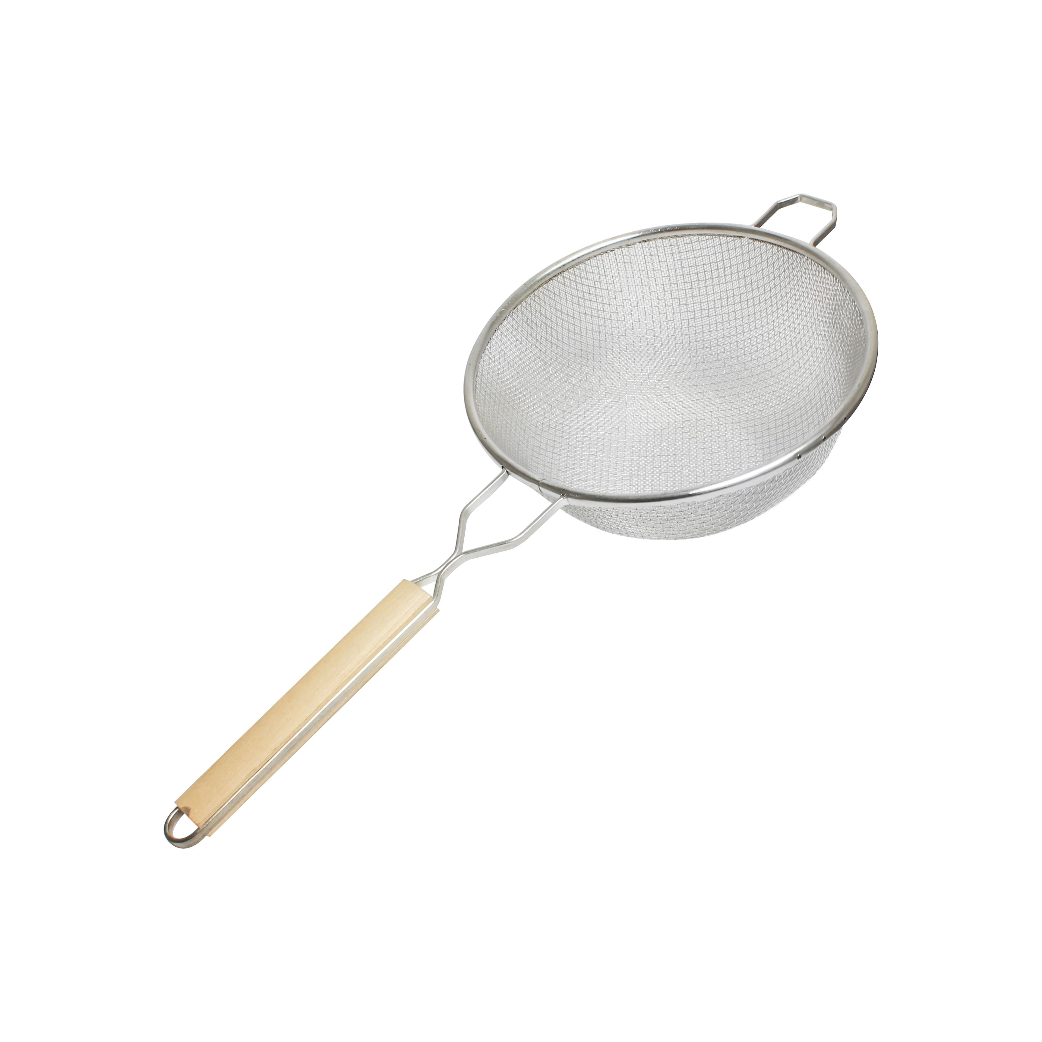 10" Diameter x 5-1/2" Height, 13" Handle Length, Fine Double Mesh Strainer, Tin Mesh with Flat Wooden Handle