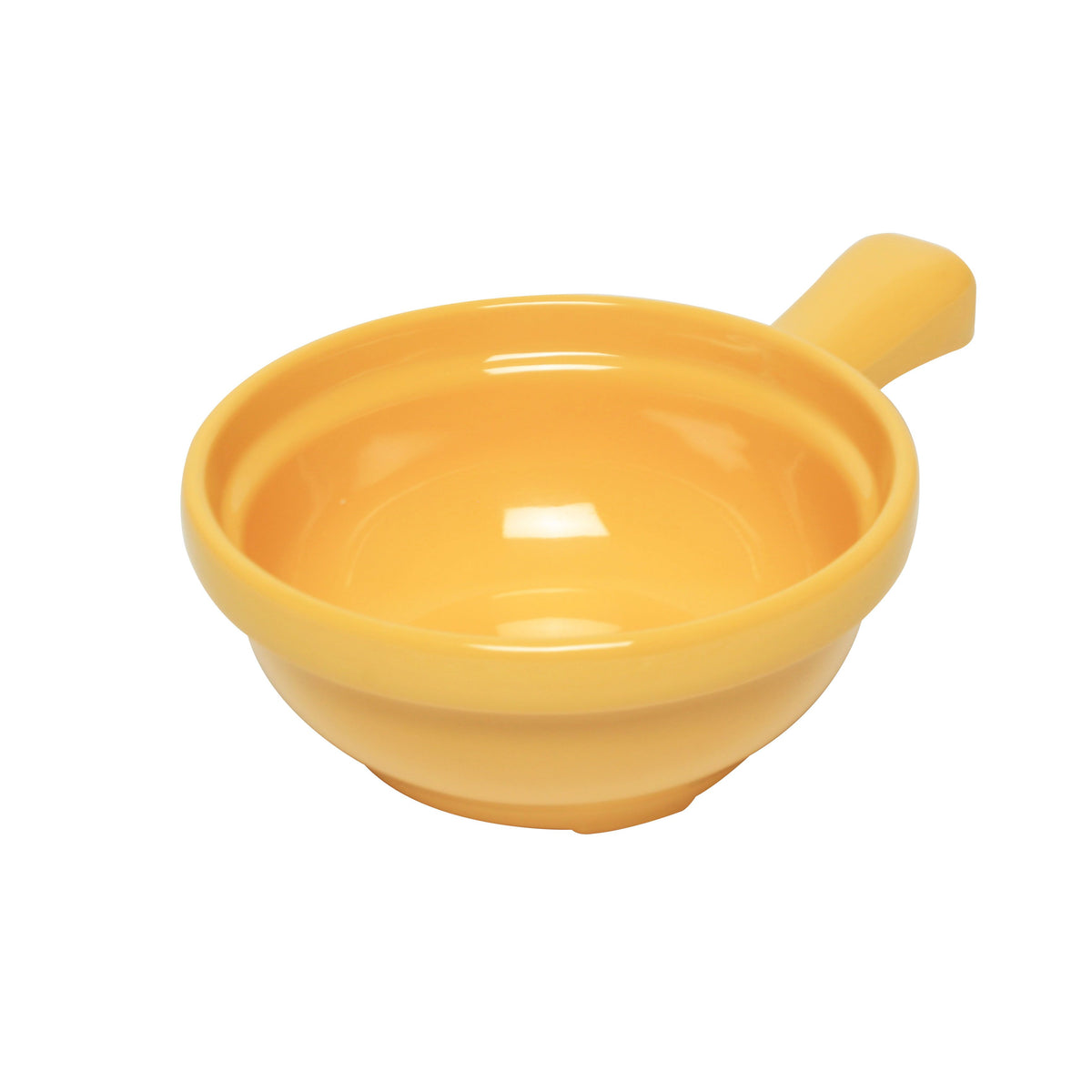 10 oz, 4-5/8" Diameter x 2" Height,, Soup Bowl with 2-1/8" Handle, Yellow Color, Melamine, BPA Free, Dishwasher Safe, Break-Resistant, Shatter-Resistant, No Microwave, No Oven, NSF