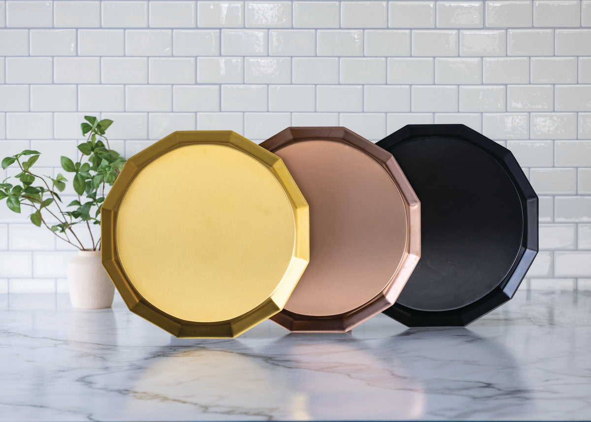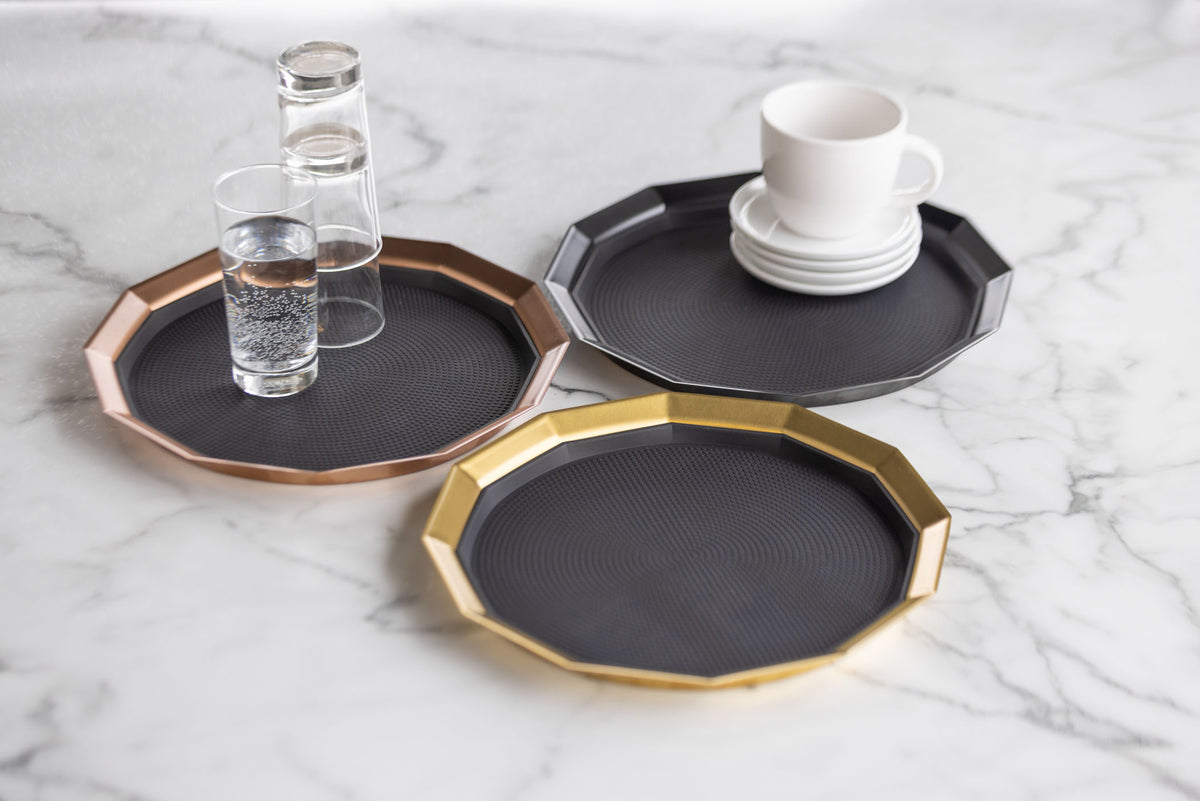 The 12-Sided Non-Slip Bar Tray blends modern design with practical functionality, making it an essential tool for professional food and beverage service. Crafted from durable 18/8 stainless steel, these trays feature a striking faceted 12-sided design that enhances presentation while ensuring stability during transport. Each tray is equipped with a removable non-slip rubber insert, providing added security for glassware and plates while allowing for a sleek, polished look when removed. Available in three sizes—small, medium, and large—and four luxurious finishes, including Brushed, Black Onyx, Vintage Gold, and Rose Gold, these trays are designed to complement a variety of service settings. With a stackable construction for efficient storage, this collection delivers the perfect blend of durability, sophistication, and versatility, making it an essential addition to bars, restaurants, and catered events.