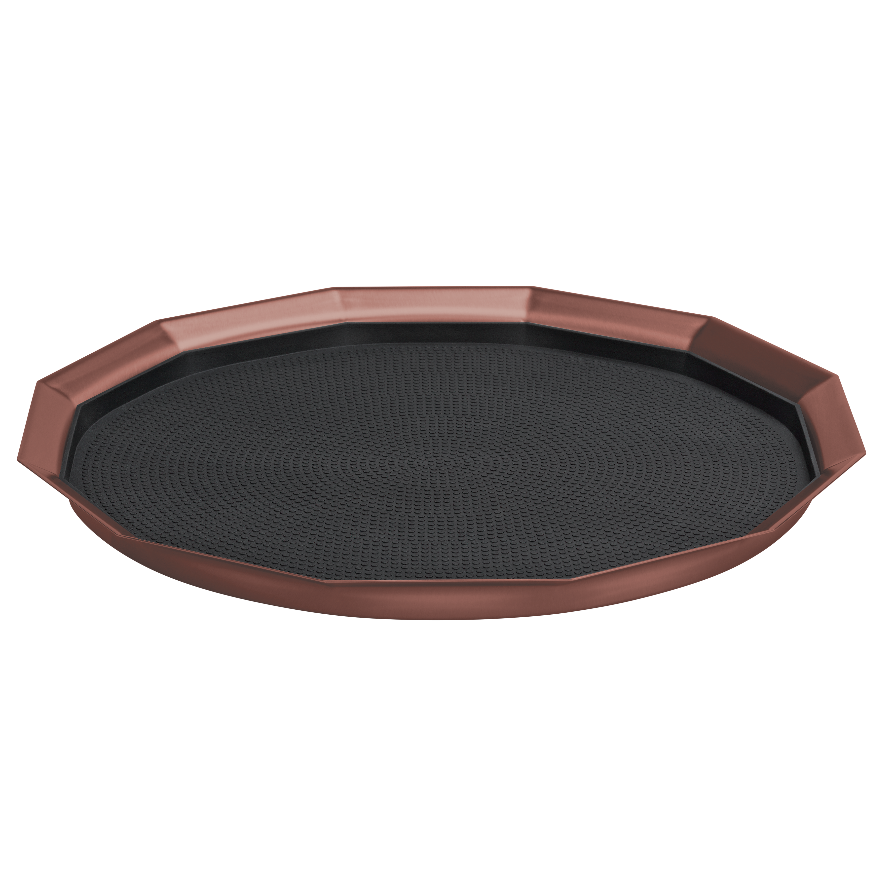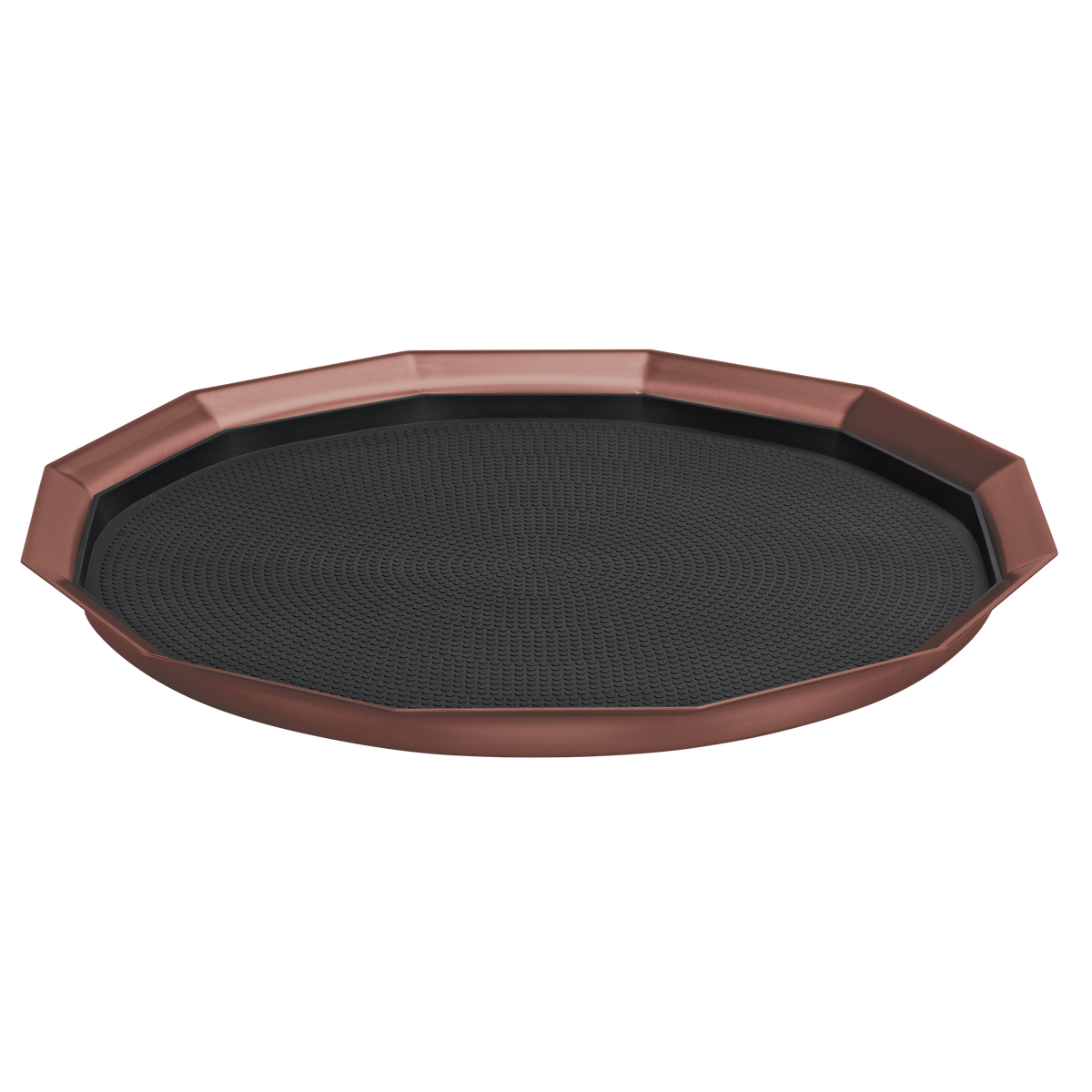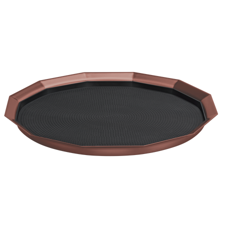 The 12-Sided Non-Slip Bar Tray blends modern design with practical functionality, making it an essential tool for professional food and beverage service. Crafted from durable 18/8 stainless steel, these trays feature a striking faceted 12-sided design that enhances presentation while ensuring stability during transport. Each tray is equipped with a removable non-slip rubber insert, providing added security for glassware and plates while allowing for a sleek, polished look when removed. Available in three sizes—small, medium, and large—and four luxurious finishes, including Brushed, Black Onyx, Vintage Gold, and Rose Gold, these trays are designed to complement a variety of service settings. With a stackable construction for efficient storage, this collection delivers the perfect blend of durability, sophistication, and versatility, making it an essential addition to bars, restaurants, and catered events.
