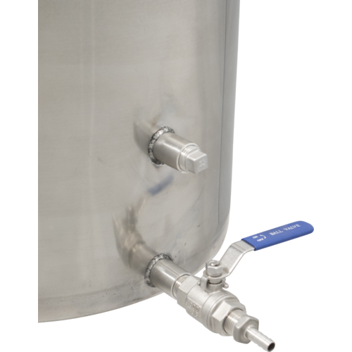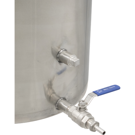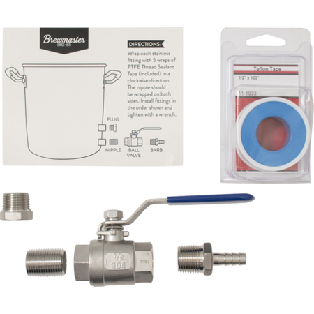 Includes a ball valve and a threaded adaptor to 3/8" barb for easily attaching transfer tubing. Also included is a threaded 1/2" plug for the thermometer port. Thermometer is not included and can be added at any time.