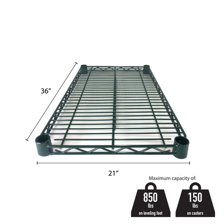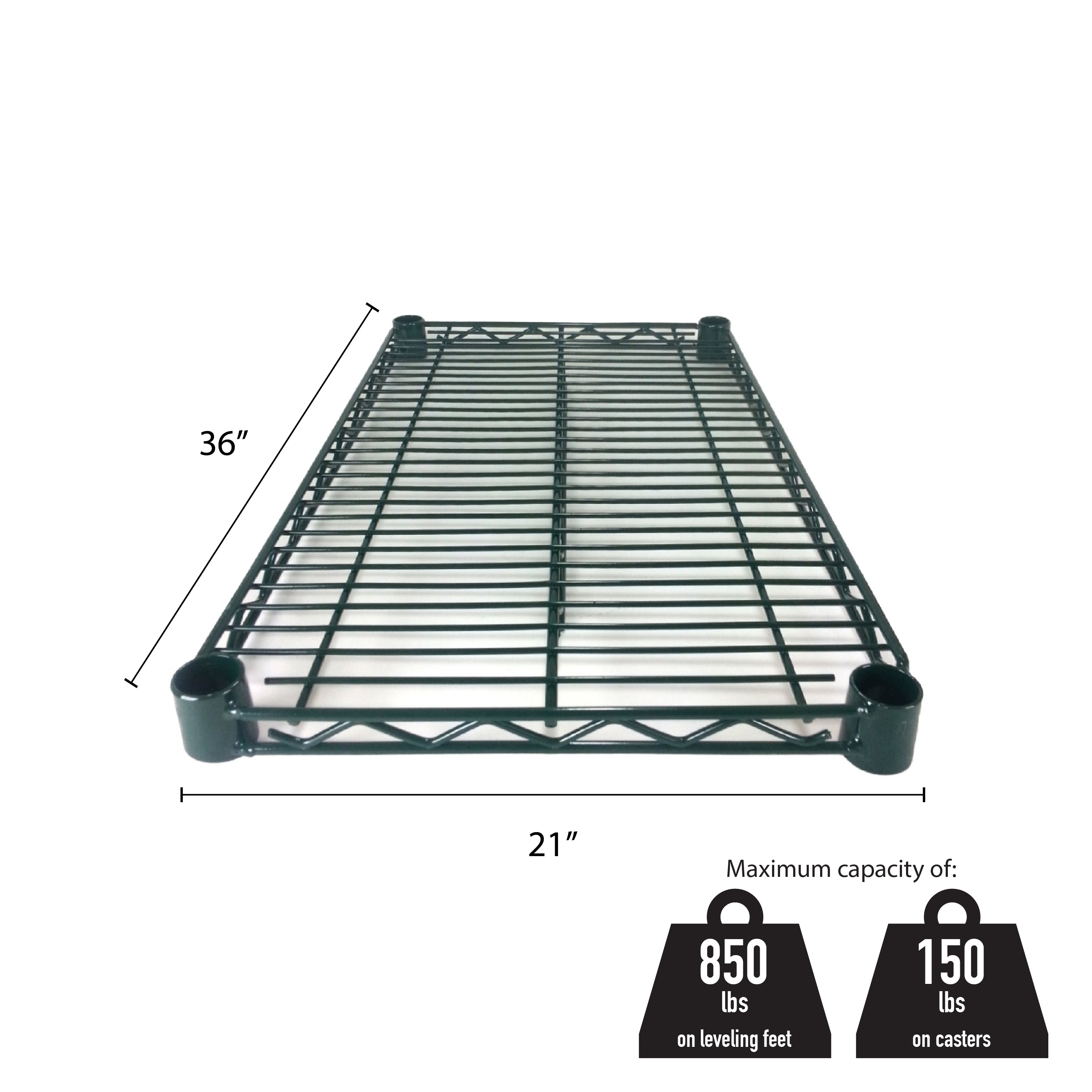 21" x 36" Shelf with 4 Set of Sleeve Clips, Green Epoxy Coated Iron Wire, 5 Years Limited Warranty, Under 48" shelf's weight capacity is up to 850 lbs. on leveling feet, when shelf is on caster, maximum weight capacity is 150 lbs., Heavy-Duty, NSF