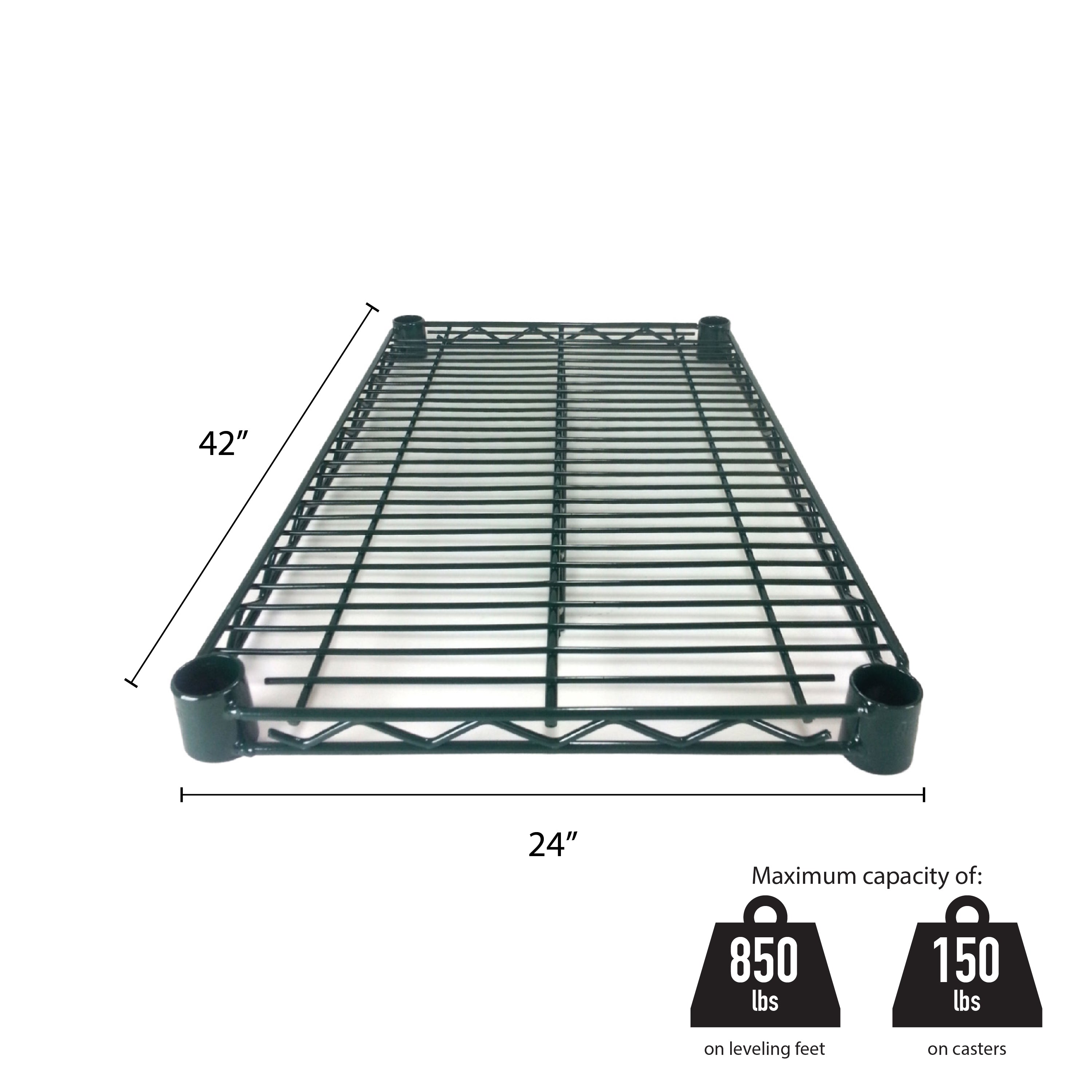 24" x 42" Shelf with 4 Set of Sleeve Clips, Green Epoxy Coated Iron Wire, 5 Years Limited Warranty, Under 48" shelf's weight capacity is up to 850 lbs. on leveling feet, when shelf is on caster, maximum weight capacity is 150 lbs., Heavy-Duty, NSF