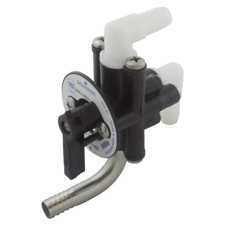 The Shurflo 3-Way Sanitizing Valve with a 3/8" barb connection is essential for thorough cleaning and sanitizing of Bag-In-Box (BIB) pump systems. This valve allows easy switching between product flow and cleaning solution, ensuring effective maintenance and preventing contamination.