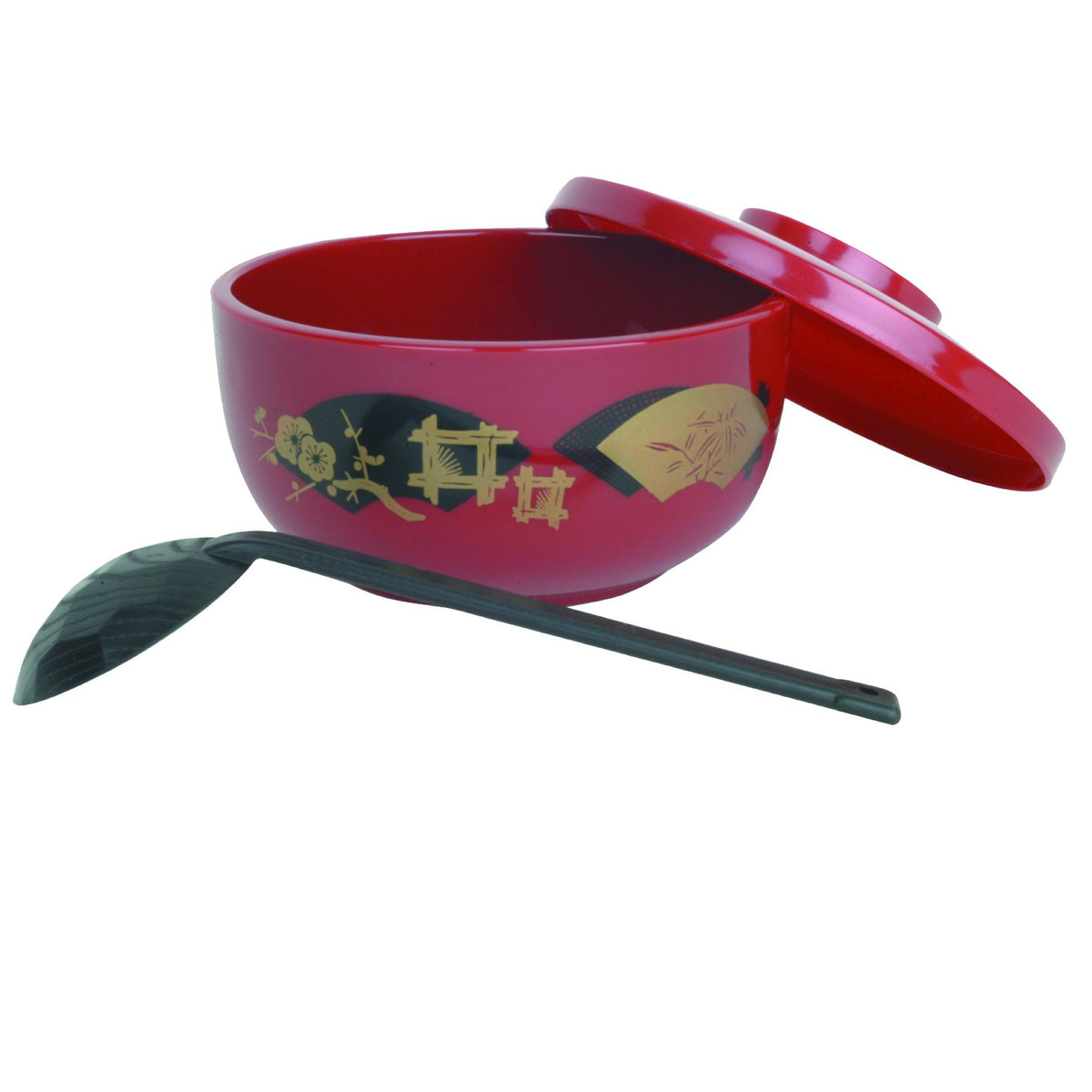 30 oz, 5-3/4" Diameter x 3" Height, Donburi Red Color Bowl with 6" Diameter x 1-1/8" Height, Donburi Red Lid and 2-1/2" Diameter x 5-3/4" Handle Length, Black Color Spoon