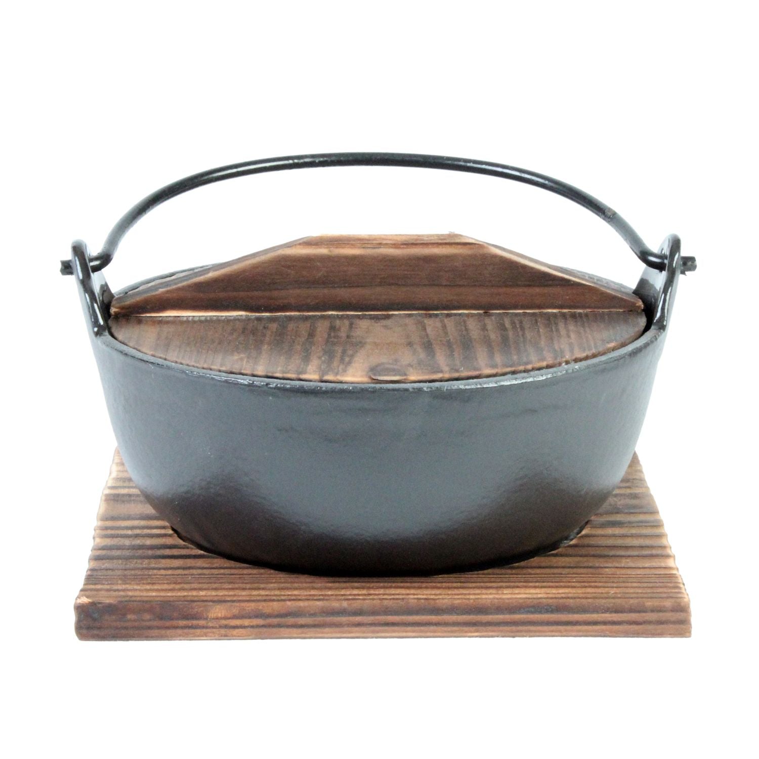 32 oz, 6-3/4" Diameter x 2-1/2" Height, Nabemono Bowl with 4" Handle Height and Wooden Lid, Cast Iron with Non-Stick Coating and 6-5/8" x 6-5/8" x 1/4" Wooden Base Board