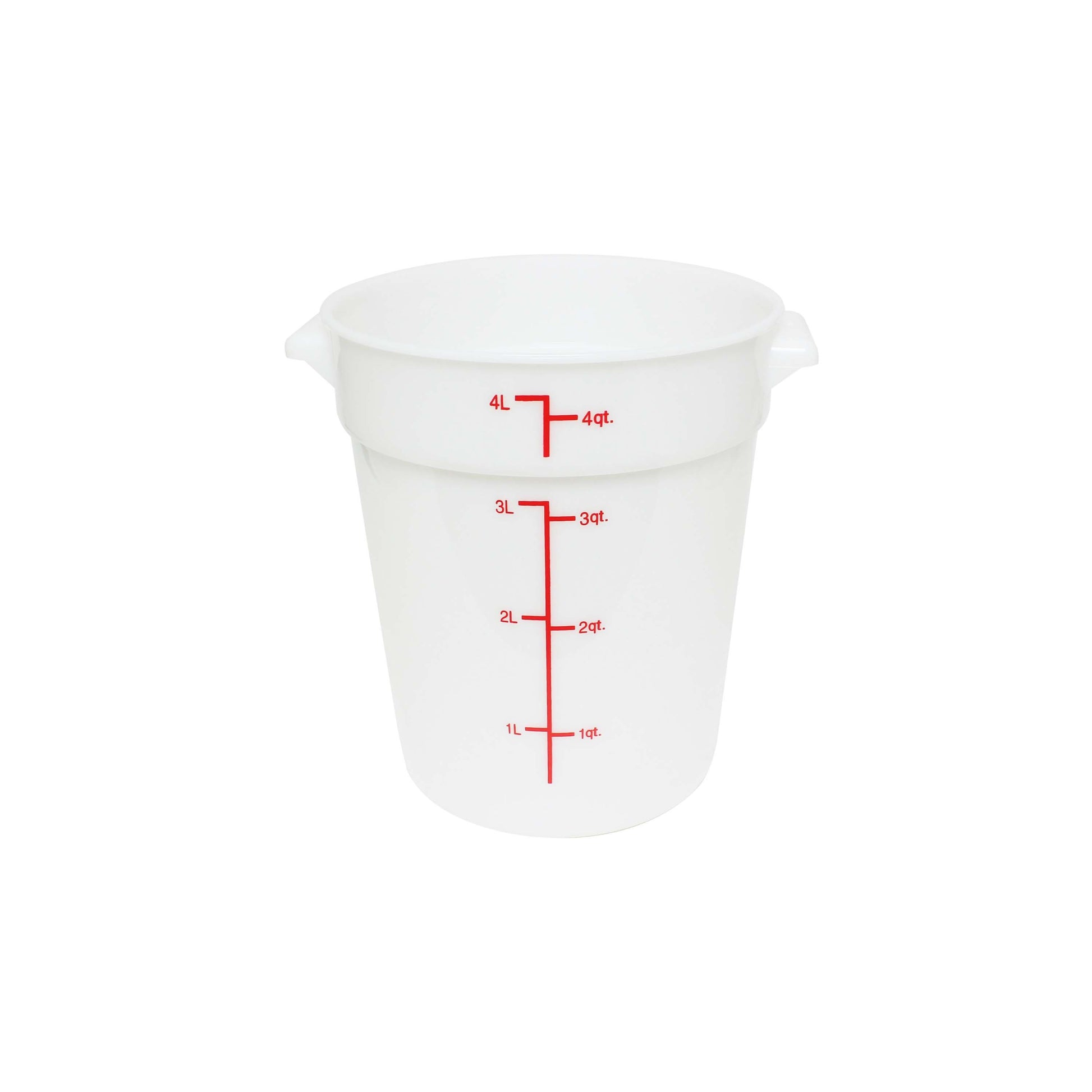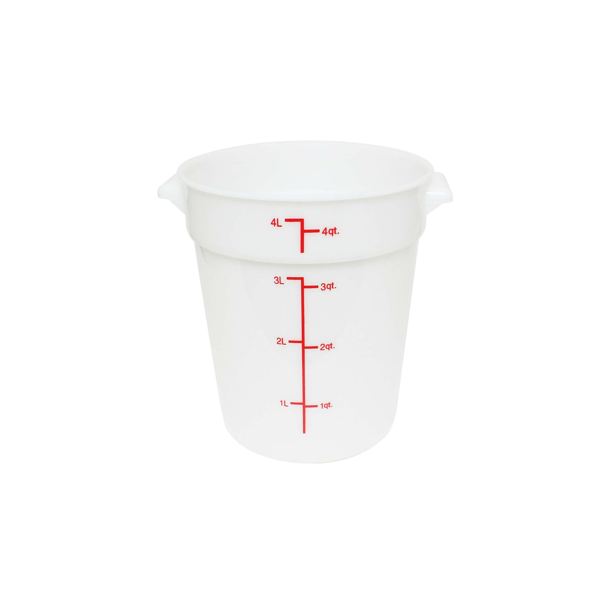 4 qt, 7-2/5" Diameter x 8-½" Height, Round Food Storage Container, White Color, Polypropylene, withstand temperature from -40°F up to 160°F, Dishwasher Safe, No Microwave, No Oven, NSF