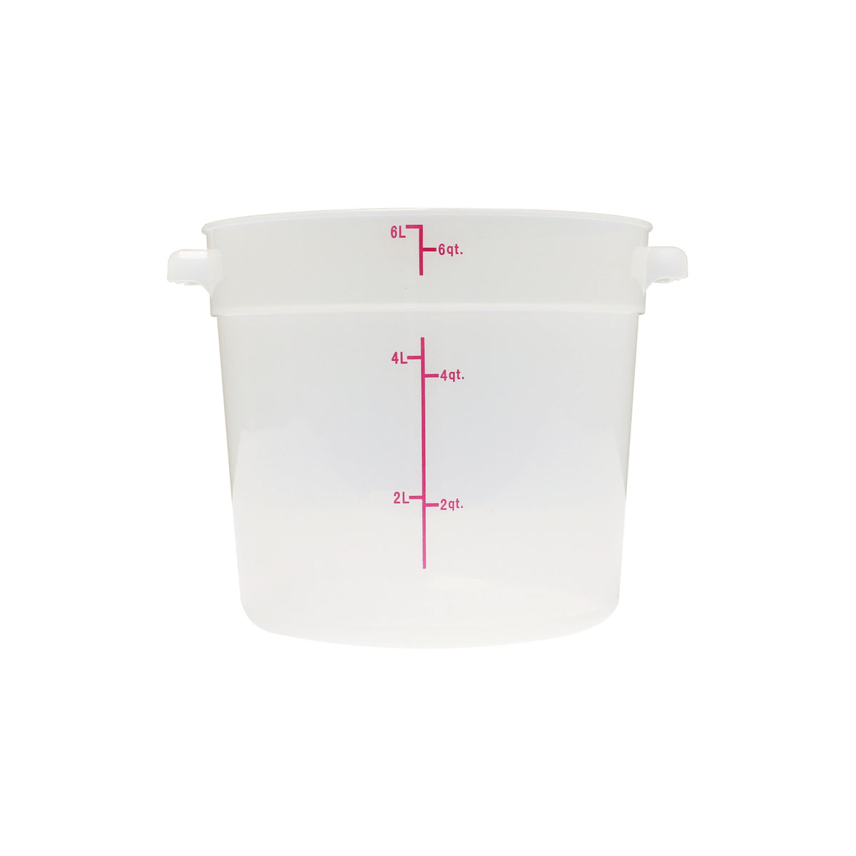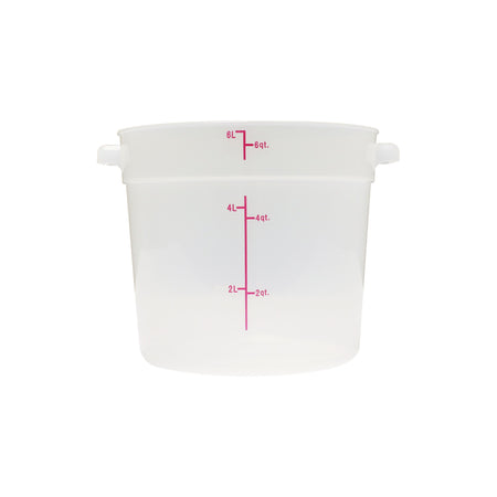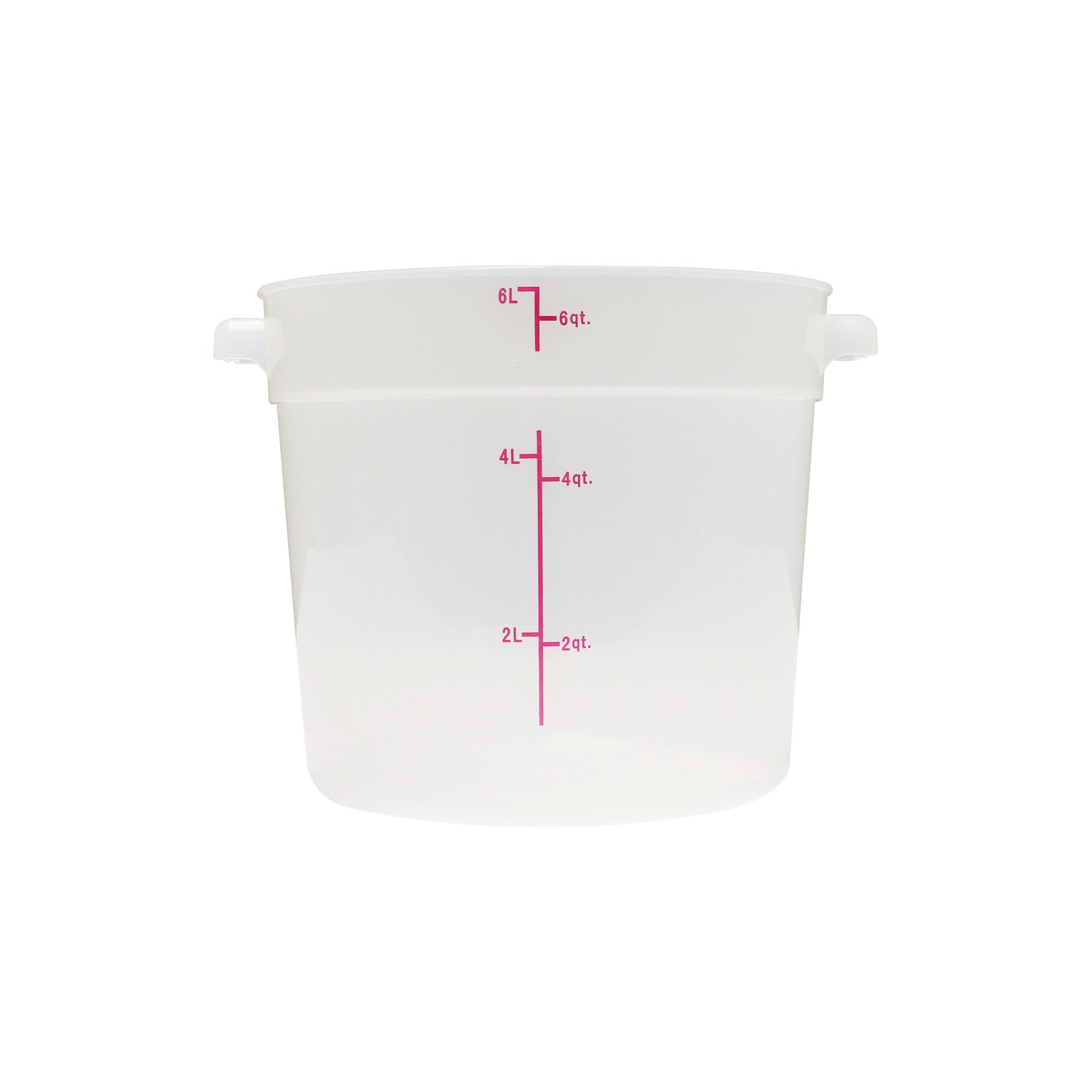 6 qt, 8-8/9" Diameter x 7-5/8" Height, Round Food Storage Container, Translucent, Polypropylene, withstand temperature from -40°F up to 160°F, Dishwasher Safe, No Microwave, No Oven, NSF