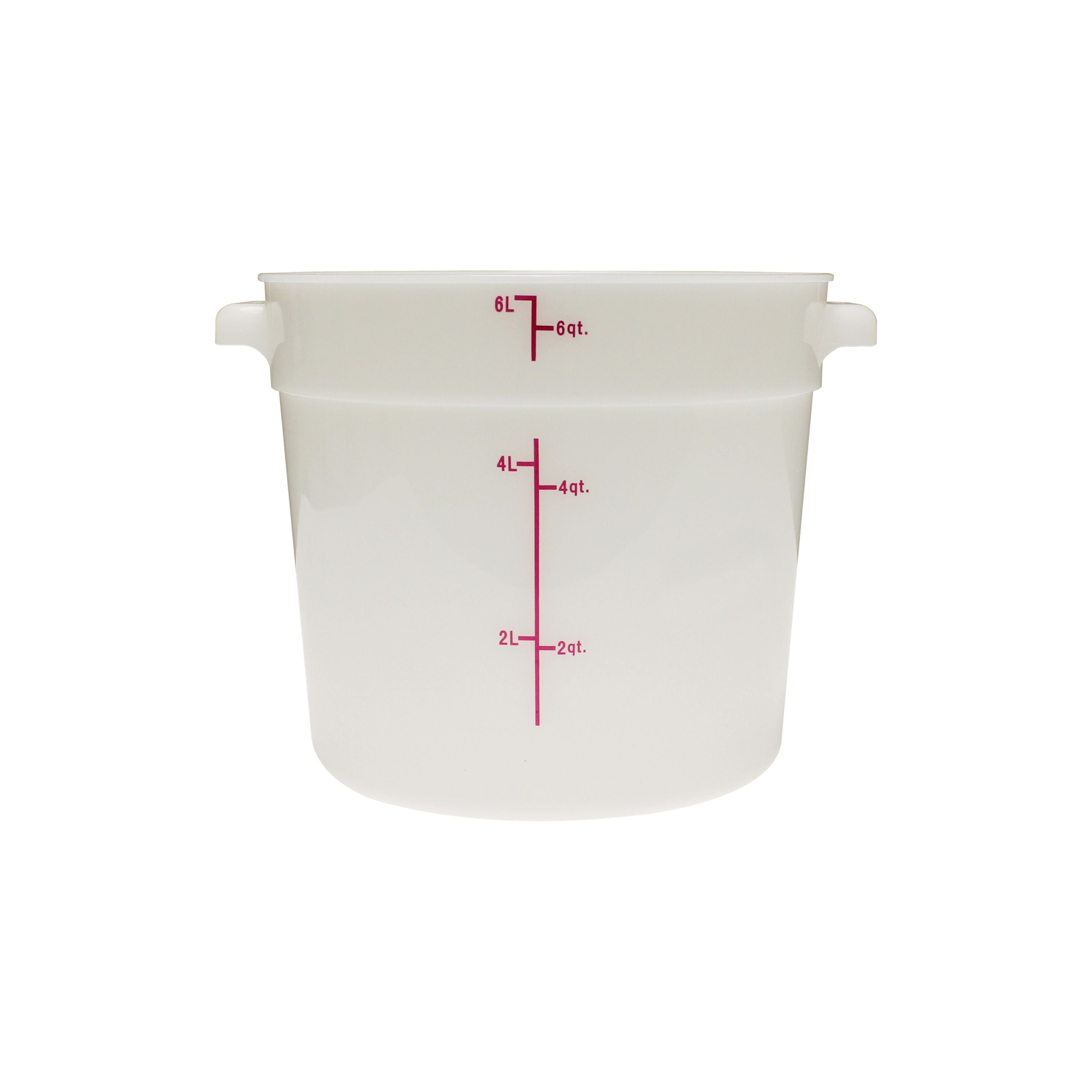 6 qt, 8-8/9" Diameter x 7-5/8" Height, Round Food Storage Container, White Color, Polypropylene, withstand temperature from -40°F up to 160°F, Dishwasher Safe, No Microwave, No Oven, NSF