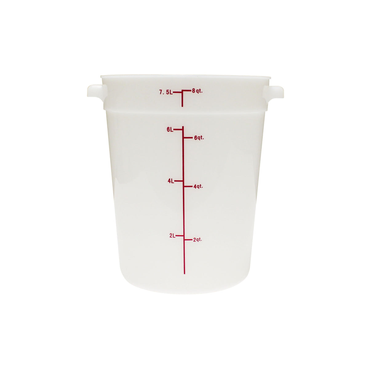 8 qt, 8-8/9" Diameter x 10-4/5" Height, Round Food Storage Container, White Color, Polypropylene, withstand temperature from -40°F up to 160°F, Dishwasher Safe, No Microwave, No Oven, NSF