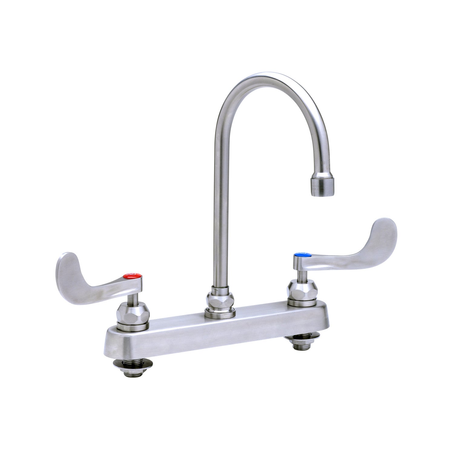 8" Stainless Steel Deck Mount Workboard Faucet with Stainless Steel 4" Wrist Action Handles and Stainless Steel Swivel Gooseneck