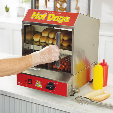 • Steams and holds 164 hot dogs and 36 buns • Graphics on each side allow for front or rear counter merchandising • Adjustable thermostat accommodates a variety of products and cooking conditions • 7Qt (6.6L) water reservoir, with low-water indicator light and safety shutoff • Tempered glass doors and food trays are removable for easy cleaning