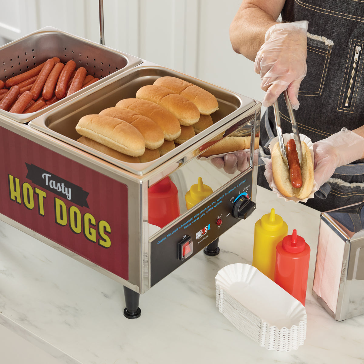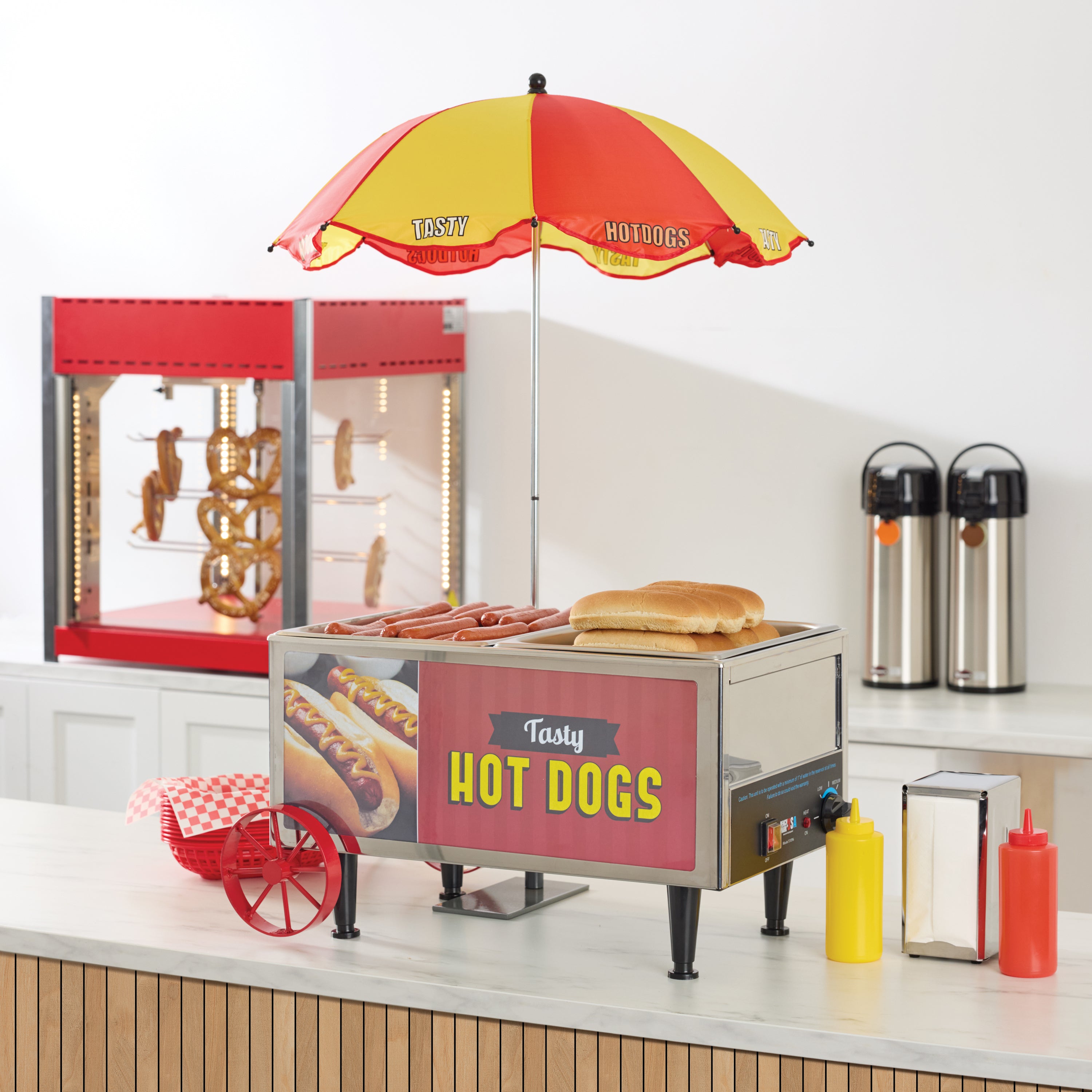 • Holds 60 hot dogs and 30 buns • Mirror finish 18/8 stainless steel body • Adjustable thermostat for cooking and holding • Includes 1 solid half-size pan with domed lid for warming buns and 1 half-size perforated pan with flat lid for steaming hot dogs • Outfitted with Point-of-Sale graphics, umbrella, wheels