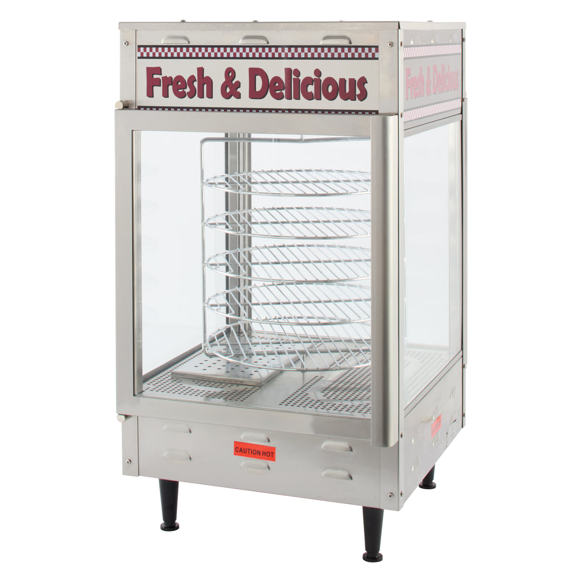• Two doors for front or rear counter applications • Attractive graphics for point-of-sale merchandising • Heated cabinet with passive humidity control • Stainless steel and tempered glass • Adjustable thermostat with cabinet temperature readout • Dual fixture interior illumination (bulbs not included) • Includes chrome-plated round pan rack (pizza) and hook rack (pretzels, churros) • Continuous rotating rack stops when either door opens • Adjustable 4" legs