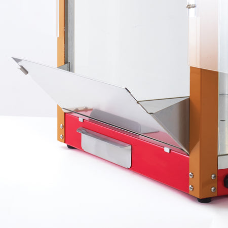 • Easy to use, simple two-switch operation • Built-in heated warming deck and warmer light (bulb not included) • Old maid drawer catches unpopped kernels • Stainless steel food-zone • Thick 20 mil non-stick coated popping kettle • Tempered glass panels on front and side • Clear plexiglass doors at rear