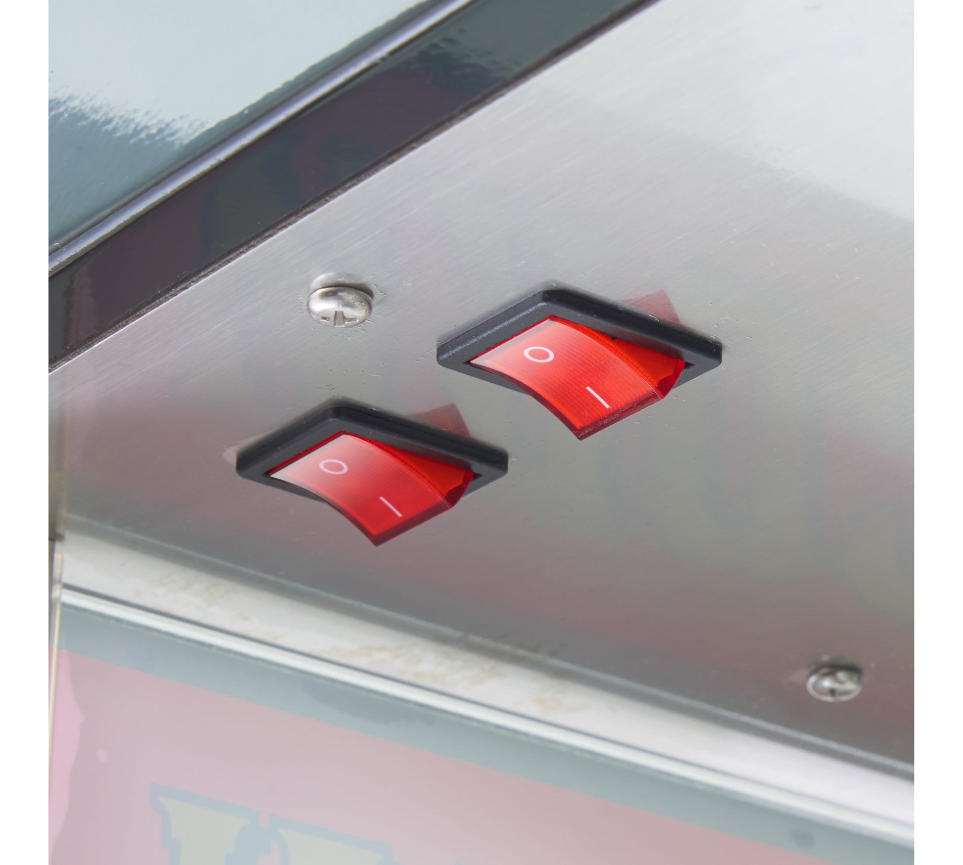 • Easy to use, simple two-switch operation • Built-in heated warming deck and warmer light (bulb not included) • Old maid drawer catches unpopped kernels • Stainless steel food-zone • Thick 20 mil non-stick coated popping kettle • Tempered glass panels on front and side • Clear plexiglass doors at rear