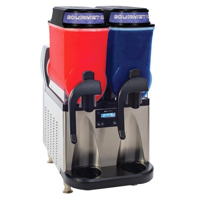 BUNN® Ultra NX granita or slushie dispenser, black and stainless steel finish with two 3 gal hoppers, extended handles, LED lit lid, low product alert, beverage monitoring technology with user interface, and USB port. Uses R290 refrigerant. 120V/60Hz. 32.4"H x 26.4"D x 16.6"W.