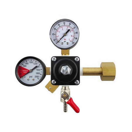 Cornelius Primary CO2 RegulatorsType: CO2Gauge s: 100 lb. & 2000 lb.Outlets: 1/4" Barb Shutoff (w/check valve)Now made with longer CO2 stems at 2-1/4" length
