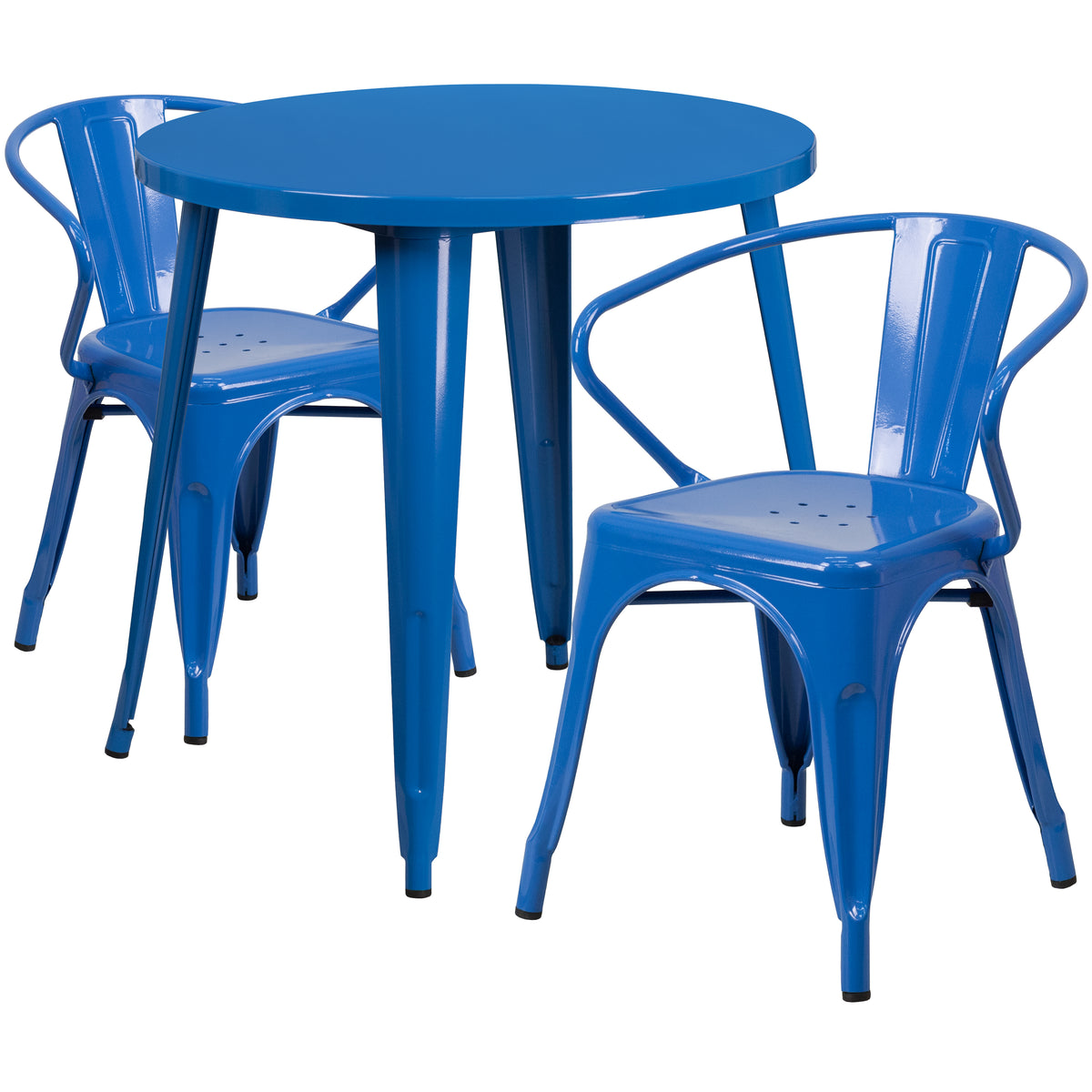 Conrad Commercial Grade 30" Round Blue Metal Indoor-Outdoor Table Set with 2 Arm Chairs