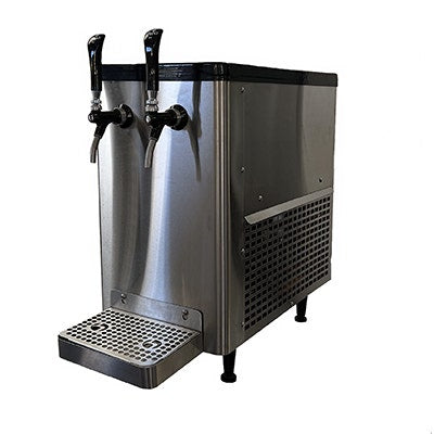 Crysalli midsized countertop dispenser for sparkling and chilled still water, with brushed 304 stainless steel finish, two ergonomic pull handle faucets, 12” bottle filling clearance, built-in carbonator with diaphragm pump, 1/5 HP compressor, 3 gal water bath, and 7 lb ice bank. Serves 37 liters (9.77 gal) per hour @