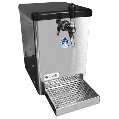 Crysalli countertop dispenser for chilled still water only, with one ergonomic pull handle faucet, built in CR-12FC water filter, CR-LBS10JG leak block sensor, and includes complete install kit. It has a 1/9 HP compressor, 1.5 gal water bath, and 3 lb ice bank. Serves 40, 8 oz drinks per hour @