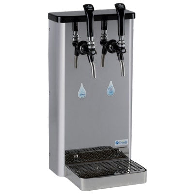 Crysalli counter mount or wall mount dispense tower with mirrored stainless steel finish, two valves with ergonomic handles, 12” bottle filling clearance, and lift-off drip tray dispenses sparkling and chilled still water. Faucet flow rate is 1.5-2 oz per second. Flow rate is adjustable to your liking and can be locked in a specific setting. For use and pairing with CR-UCM1 or CR-UCM2 remote chillers. 10.69"W x 10"D x 20.75"H.