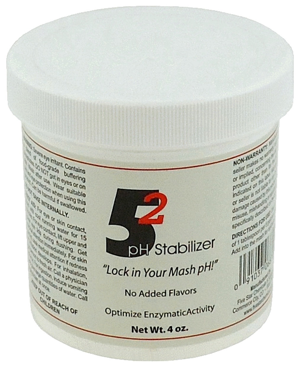 Five Star ProductsFor Master Brewers Home Brewers & General Line Cleaning52pH StabilizerOptimizes the enzymatic activity of your malt and he lps clarify wortSize: 4 oz.