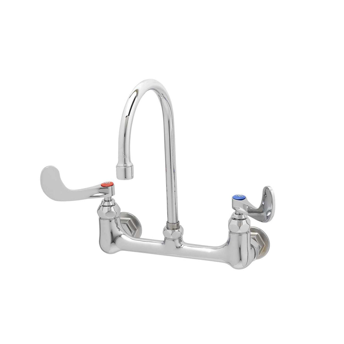 Double Pantry Faucet, Wall Mount, 8" Centers, S/R Gooseneck, 4" Wrist Action Handles
