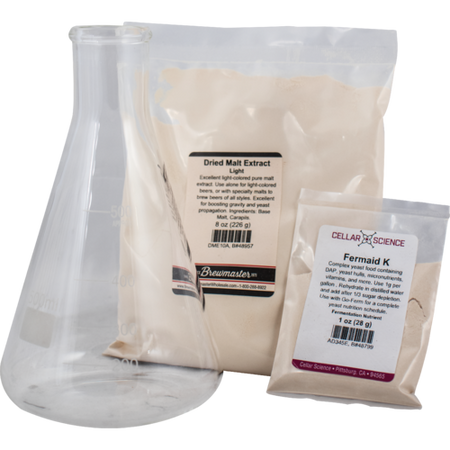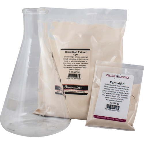 500ml Erlenmeyer flask, 1/2lb light dried malt extract & 1oz Fermaid K (Yeast Nutrient). This starter kit is for growing liquid yeast starters. The idea is that the starter acts as a mini batch of beer where the yeast cells replicate before being pitched into your 5 gallon batch. More yeast means fermentation starts faster. The bacteria and wild yeast that got into your beer during the transfer from kettle to fermenter have less chance of creating a negative flavor impact upon your beer.
