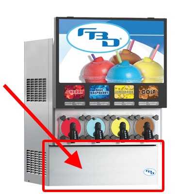 Extended splash plate for a FBD® 774 frozen beverage dispenser.