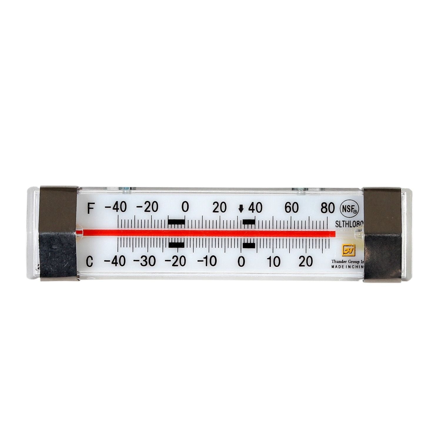 From -40°F to 80°F Horizontal Liquid Scale Thermometer, Stainless Steel Case, Glass Lens, Polyvinyl Chloride Screen Display, NSF