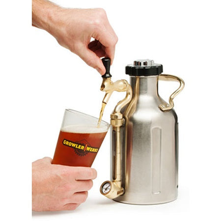 Introducing the all new uKeg 128 pressurizable growler from Growler Werks. Made from double-layer, vacuum-insulated stainless steel, this mini keg will keep your beer fresh and cold anywhere. Fitted with a CO2 regulating cap and tap handle. Includes two 16 g CO2 Cartridges, brass handle and integrated pressure gauge.