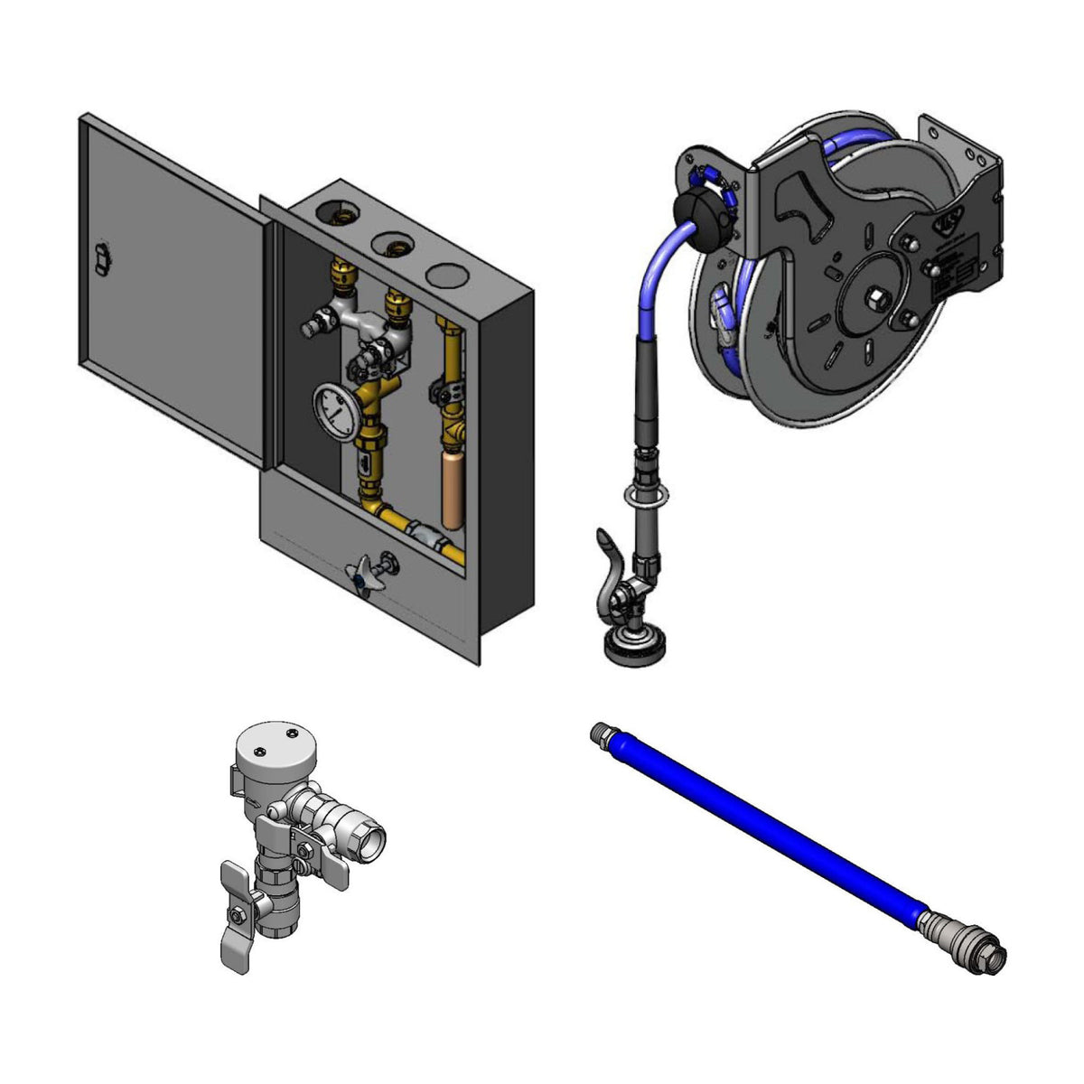The T&S Brass B-2339-7132MVBH represents the absolute maximum in industrial washdown infrastructure. This comprehensive system integrates a **35-foot open stainless steel hose reel** with a centralized control cabinet. It is equipped with a Control Valve, Dual Check Valves, and an Atmospheric Vacuum Breaker to ensure absolute backflow safety and operational control. Designed for high-specification food processing plants and stadium sculleries, it provides high-capacity rinsing power while maintaining code compliance and hardware protection.