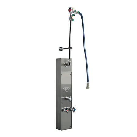 Hose Reel SS Cabinet for Surface Bottom Inlet Mounting w/ Mixing Valve. Control Valve, Service Stops, In-Line Vacuum Breakers, Inlet Unions, Eterna Cartridges w/ 4-Arm handles & Hose Reel Connector Kit