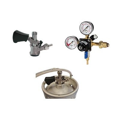 This Crysalli install kit includes a primary nitrogen regulator, plumbing connections, and one D style keg coupler.