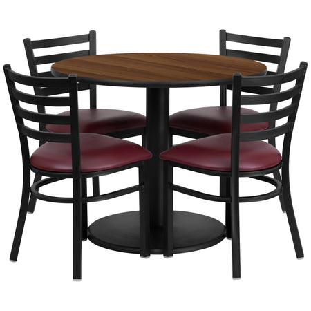 Jamie 36'' Round Walnut Laminate Table Set with Round Base and 4 Ladder Back Metal Chairs - Burgundy Vinyl Seat