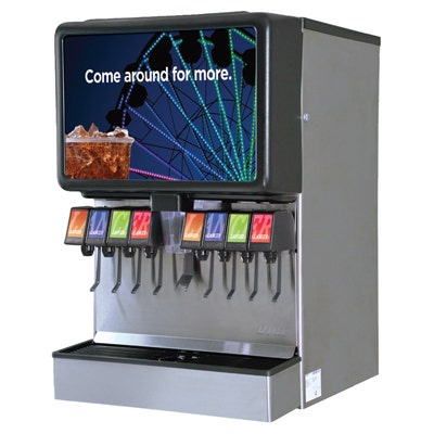 IBD22CB 4500 cold carb post-mix ice drink dispenser has 6 LEV® self serve lever valves, insulated 200 lbs ice bin, and illuminated Coke® graphics (graphics are subject to change). 115V/60Hz. 22"W x 30.5"D x 40.25"H.