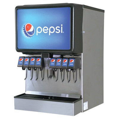 IBD25CB 4500 cold carb post-mix ice drink dispenser has 8 LPV VersaPour self-serve lever valves, 234 lbs ice capacity, 3-way back block, and LED illuminated Pepsi™ graphics (graphics are subject to change). 115V/60Hz. 25"W x 30.5"D x 40.25"H.