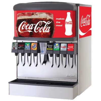 IBD25H 4500 post-mix ice drink dispenser for cubed ice has 8 LEV® self-serve lever valves, insulated 205 lbs ice bin, low-ice indicator, ice agitation, 3-1-1-3 manifold, key lock switch, and illuminated Coca-Cola® graphics (graphics are subject to change). 115V/60Hz. 25"W x 30.5"D x 35.375"H.