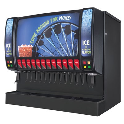 Sensation IBD44 post-mix ice drink dispenser has 12 VersaPour self-serve lever valves, 8 bonus flavors, chewable ice dispense on both sides, 312 lbs ice bin, black exterior, flex manifold 3-1-1-1-1-1-1-3, key lock switch, and general beverage graphics (graphics are subject to change). 115V/60Hz 6amps. 44"W x 31"D x 39.375"H.