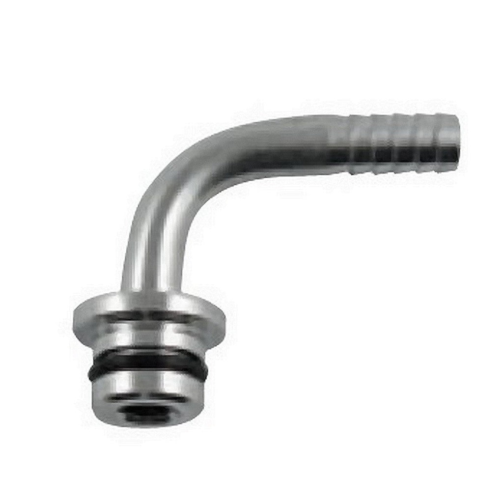 The Shurflo 90° liquid elbow with 1/4" barb provides a tight, 90-degree turn in beverage dispensing lines, helping optimize tubing routing in tight spaces. Made from stainless steel, it offers durability and corrosion resistance for long-lasting use.