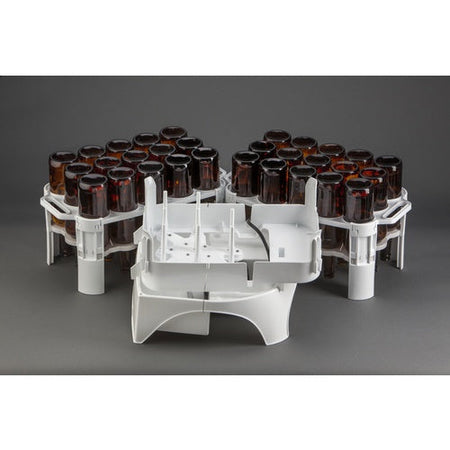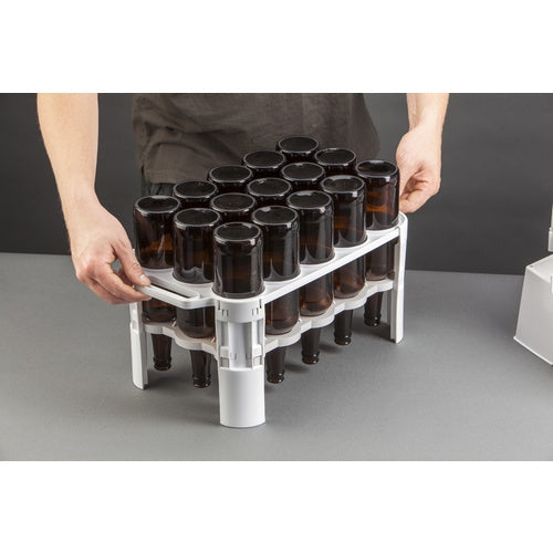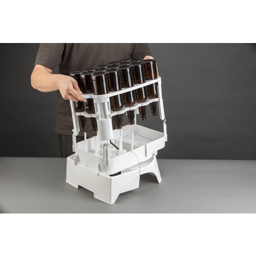 Mark's Bottle Washer is designed to work as an add on to Mark's Keg and Carboy Washer. The bottle washing system allows you to efficiently handle thirty 22 ounce bottles. With this system, you can wash, rinse and sanitize enough bottles for a standard 5 gallon batch of beer. The system contains 3 components: the 8-jet manifold, the drip pan and the 2 trays.