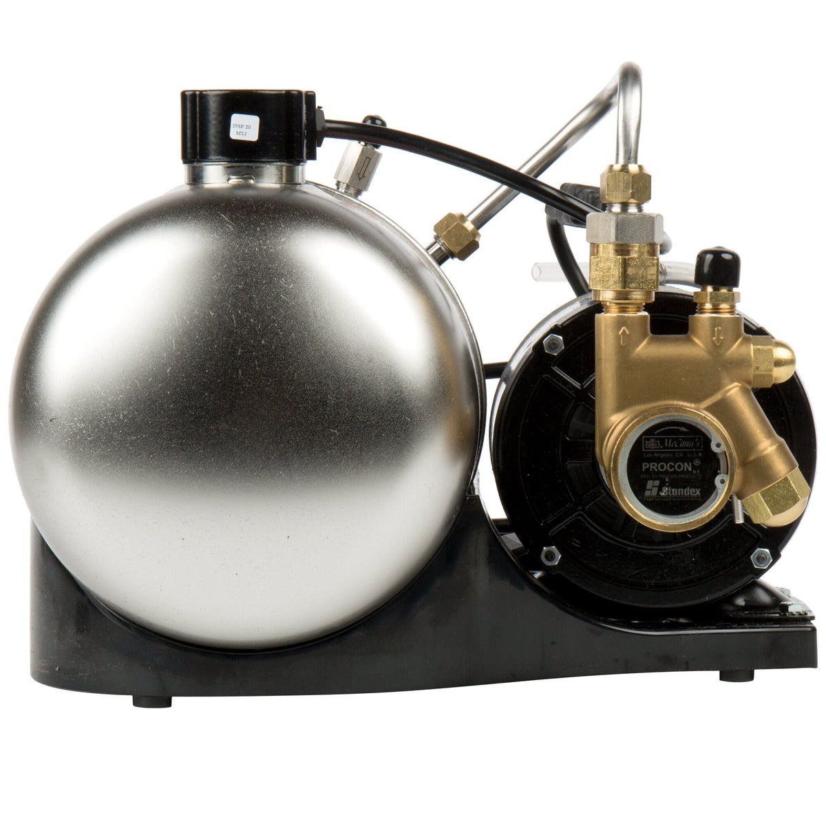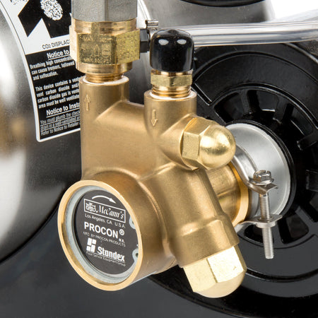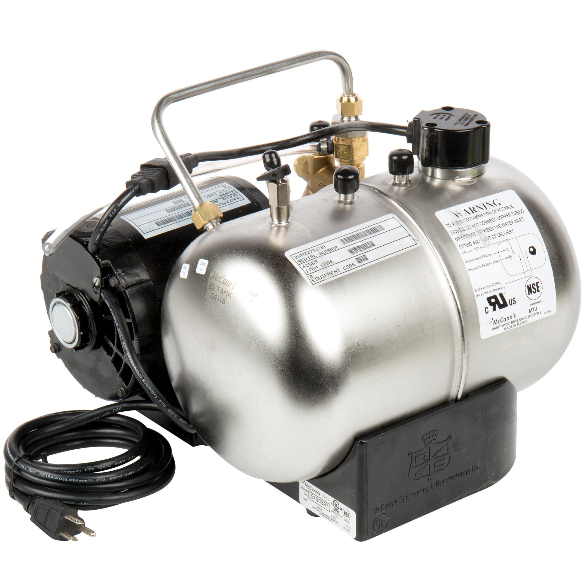 Complement your soda machine with this McCann's E400397-PP Big Mac E-Series Fastflow carbonator. Designed to provide the fizz for your carbonated drinks, this carbonator takes plain water and CO2 and combines them to create carbonated water. It uses a durable rotary-vane style brass water pump that delivers water in an atomized form to the carbonator tank. It includes an internal 100 micron strainer and a 180 PSI pressure relief valve. Plus, it is made of stainless steel so it is easy to clean and durable.