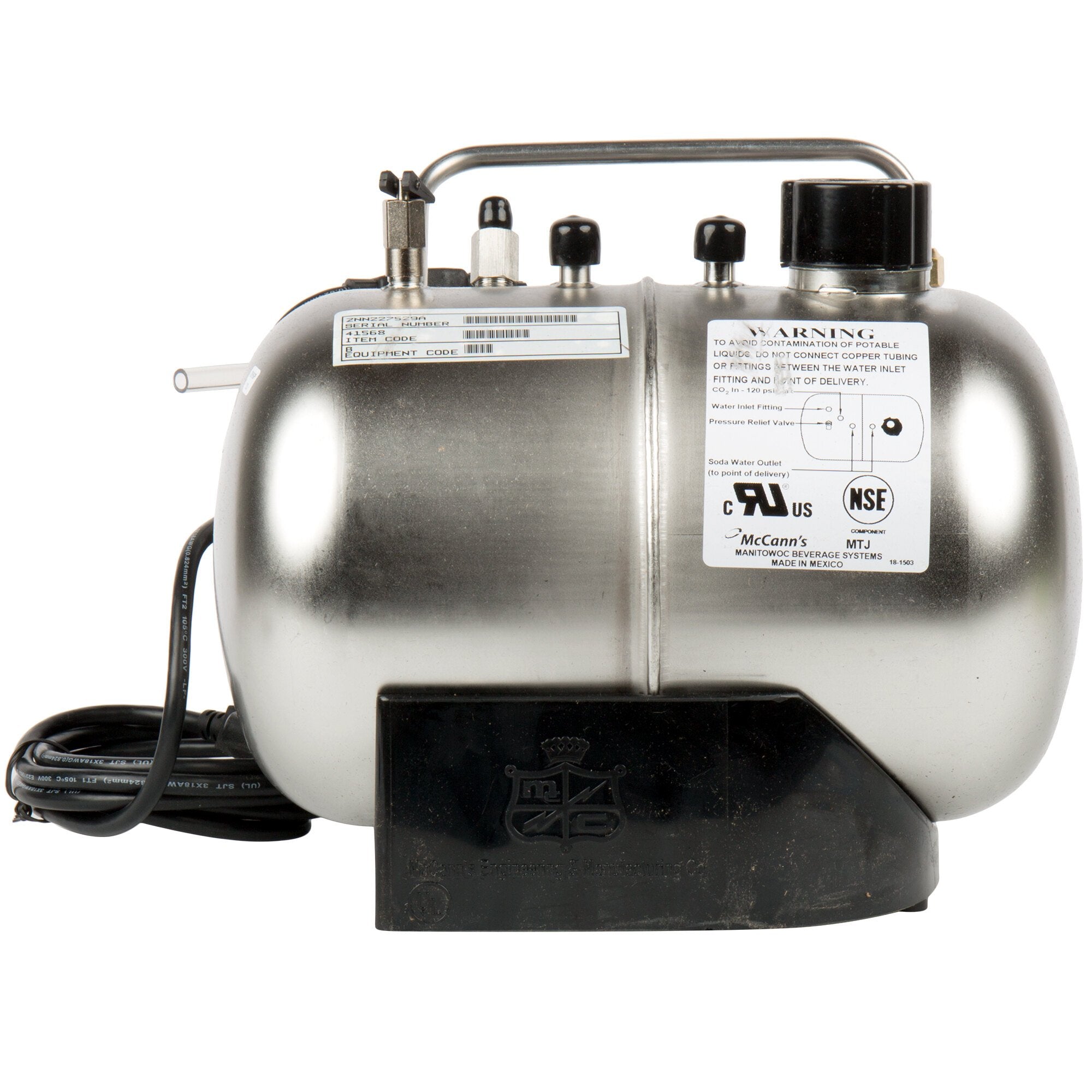 The tank is made of durable stainless steel and has a capacity of 180 fl. oz. The liquid-level float assembly and heat sink probe cap help extend the product life and prevent issues down the road. This carbonator unit sits on an injection molded plastic base that helps to cushion the unit and reduce noise from vibration. It even comes equipped with a backflow prevention device to reduce the chances of contaminated water flowing back into the clean water supply. This model has a 1/3 hp, 1,725 RPM motor and requires a 115V electrical connection for operation.